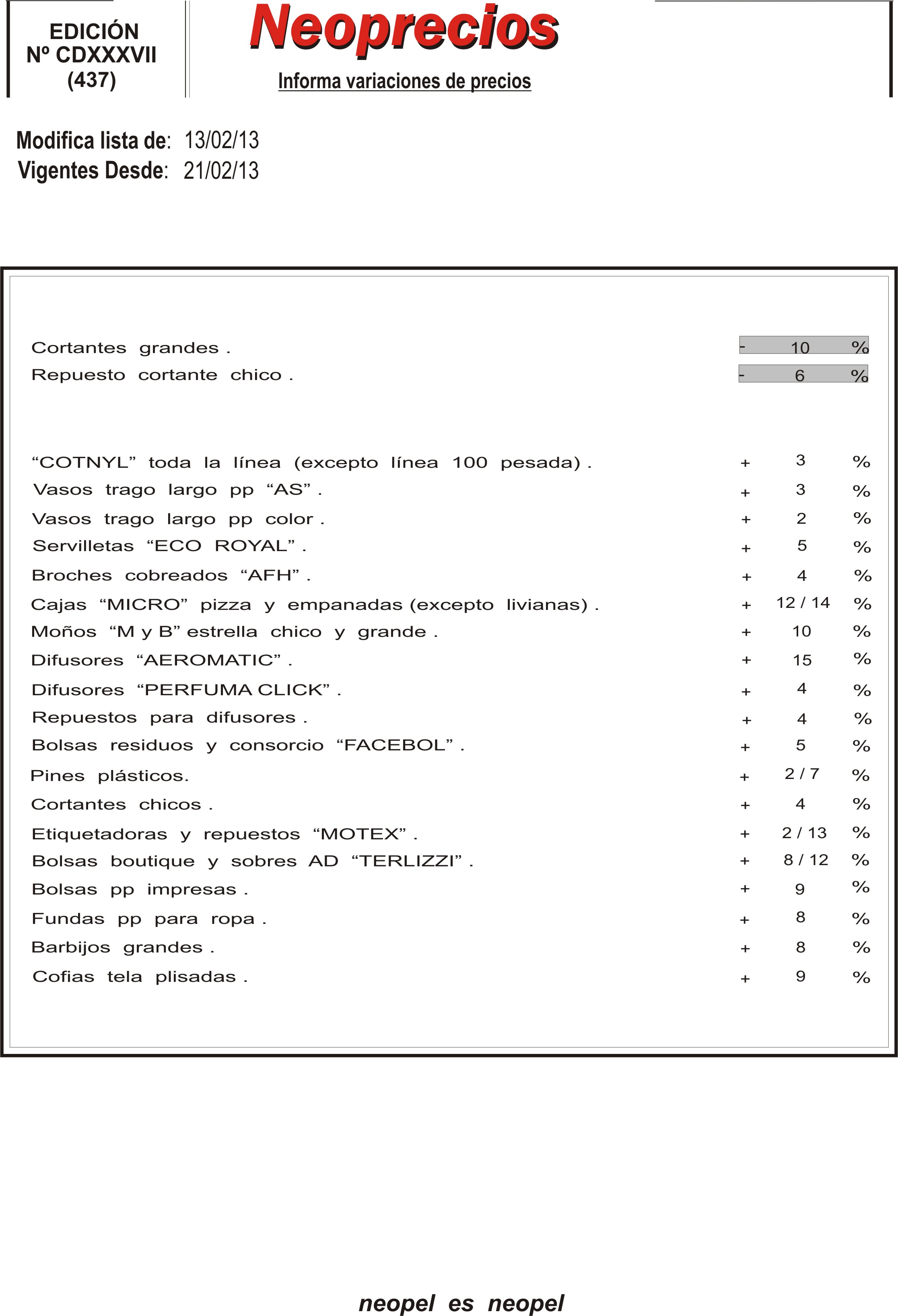 Edición 437 14/02/2013/en Neoprecios /por neopelModifica lista de: 13/02/13 Vigente desde: 21/02/13 NEOPRECIOS 436 Descargar NEOPRECIOS https://neopel.com.ar/neopel/wp-content/uploads/2015/02/Neopel-logo.png 0 0 neopel https://neopel.com.ar/neopel/wp-content/uploads/2015/02/Neopel-logo.png neopel2013-02-14 14:16:272013-03-13 13:09:05Edición 437